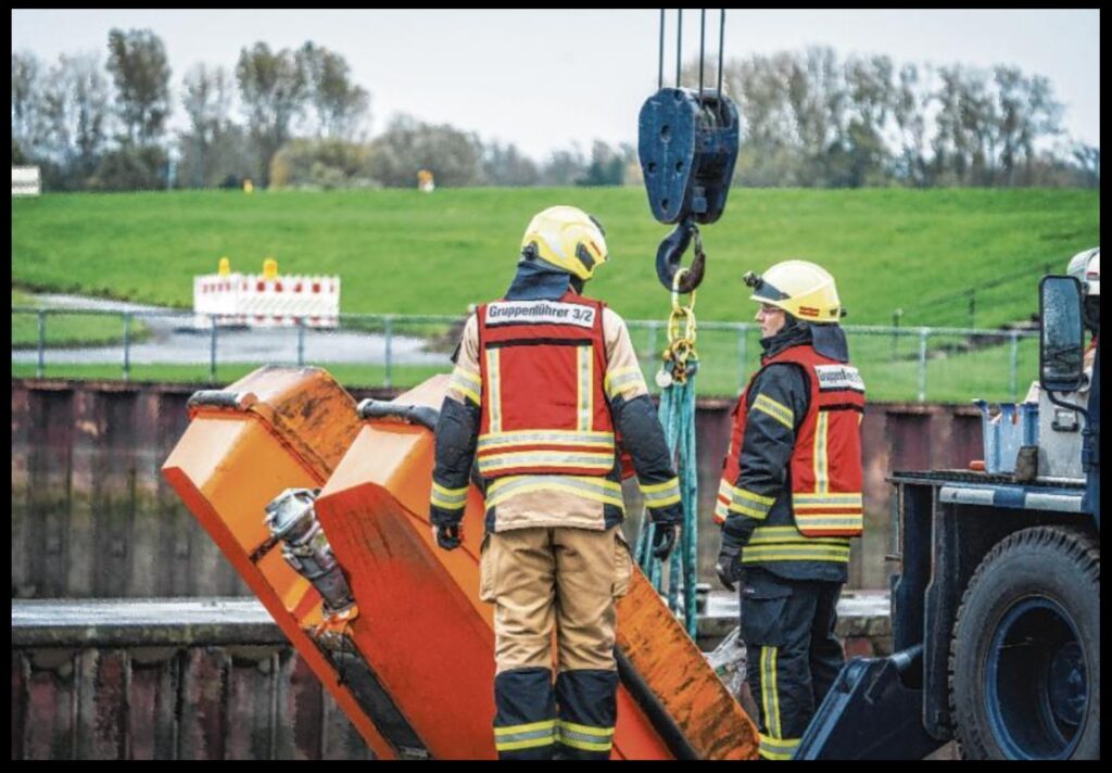 So sah sich der „Technische Zug“ am Ochtumer Hafen mit einem komplexen „Verladeunfall“ konfrontiert. Ein Boot hing schief an einem Mobilkran, der selbst zu kippen drohte. In dem Boot befanden sich Verletzte, eine unbekannte Anzahl an Personen war zudem ins Hafenbecken gestürzt. Während mittels eines Krans Boote von Feuerwehr und DLRG zu Wasser gelassen wurden, sicherten weitere Kräfte den havarierten Mobilkran und leiteten die Menschenrettung aus dem in der Luft hängenden Boot ein.